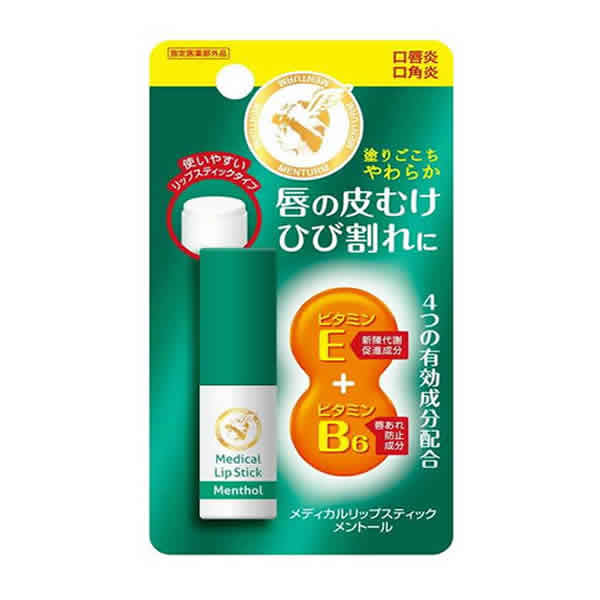 ●普段使い慣れたスティック形状の口唇炎・口角炎用リップで、塗りやすく、外出先でも手を汚さずに使用できます。●5つの有効成分がひどい唇荒れをケアアラントイン:組織修復促進成分ビタミンE:新陳代謝促進成分ビタミンB6:唇あれ防止成分グリチルレチン酸:炎症抑制成分d L-メントール:冷感・血行促進成分●塗り心地やわらか●メントール