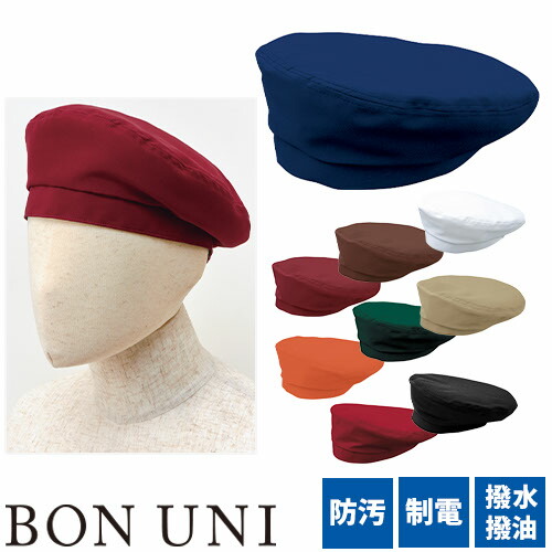 ◎商品名:ベレー帽◎メーカー:ボンユニ(BONUNI)◎品番:28321-29、28321-47、28321-59、28321-69、28321-72、28321-79、28321-81、28321-99、28321-15◎カラー:29.エンジ、47.オレンジ、59.緑、69.ボルドー、72.ベージュ、79.茶、81.白、99.黒、15.ネイビー◎サイズ:F◎素材:トロピカル ポリエステル100%◎機能:イージーケア、耐塩素、撥水・撥油・耐久防汚(リップガード)、制電◎ブランド:BON JOYFUL◎仕様:アジャスター付◎商品説明:・水や油をはじいて、埃や泥汚れからもウェアを保護し、きれいに保ちます。・シワになりにくく、簡単なアイロンがげ、もしくはノーアイロンでOK。◎シリーズ:イージーケアエプロン&アクセサリー◎リップガード(撥水・撥油、耐久防汚):しつこい汚れがみるみる落ちる!高度な除去性能と抜群の耐久性を持った素材です・耐久撥水性・撥油性に優れています・水・油などの汚れがつきにくく、ついた汚れ
