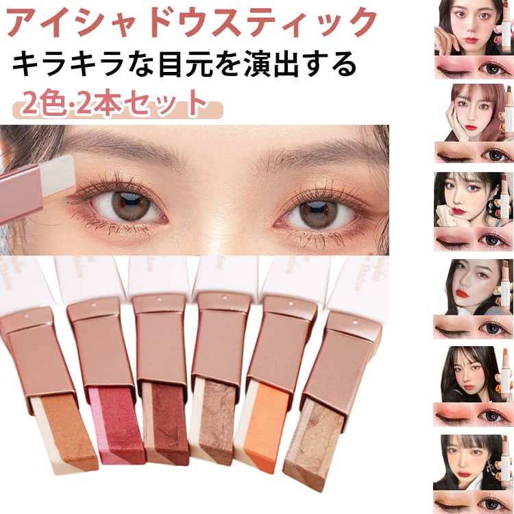 ■アイシャドウ 簡単メイク メイクアップ 時短メイク 初心者 スティックアイシャドウ 2本セット 2色グラデーション ひと塗り 高発色 キラキ