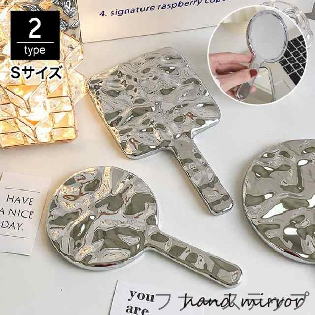 手鏡 ハンドミラー スクエア ラウンド 角形 丸型 凸凹 エンボス 波模様 コンパクト 持ち手 手持ち メイクアップ 化粧直し