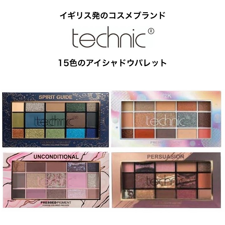 ロンドン発のコスメティックブランドtechnic(テクニック) 15色のアイシャドウパレット パースエイジョン(PERSUASION) ブラウン系の落ち着いたパレット。 マーブル柄、粒柄のラメは濡れツヤ感があり、メイクのクオリティを簡単に上げられます。 ワイトゥーケイ(Y2K) ベージュやブラウンを中心に、使いやすい配色のパレット。 小粒のブルーラメ、オーロララメがアクセントになり、目元をパッと明るい印象に導きます。 アンコンディショナル(UNCONDITIONAL) 目元を華やかに彩るピンク系パレット。 見た目も楽しいマーブル柄のラメが特徴です。 スピリットガイド(SPIRIT GUIDE) ラメとダークカラーを中心とした個性的なパレット。 対となるブルーカラーが、メイクに透明感をもたらします。