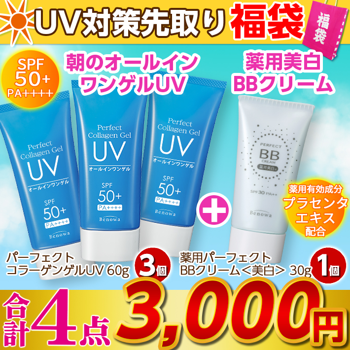 内容量:パーフェクトコラーゲンゲルUV 60g 3個、薬用パーフェクトBBクリーム<美白> 30g 1個