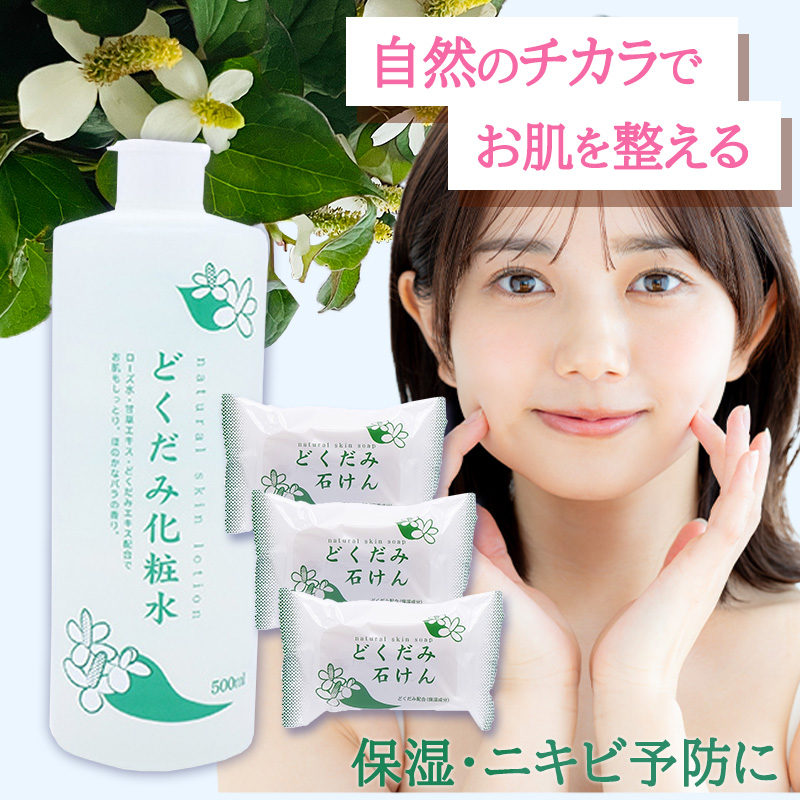 \コスパ最強!たっぷり大容量のスキンケアセット/ ◆どくだみ化粧水500ml *さっぱりした使用感で、みずみずしいお肌へ 自然派化粧水、保湿成分のどくだみエキスが、お肌にうるおいを与え、キメを整えます。 また甘草エキス(保湿成分)、ローズ水を配合し使用感をよりよくしました。 全身用ローションとしてもお使いいただけるどくだみ化粧水は、 コスパ最強なので、全身に惜しまずバシャバシャお使いいただけます。 ◆どくだみせっけん130g *超プチプラ 石鹸として密かに人気な『 どくだみ石けん(DNスキンソープN)』 130gのBIGサイズで経済的!シンプルでナチュラルなどくだみ石けんです。 *洗顔用、浴用として全身にご使用いただける化粧石けんです。 植物油脂原料の泡立ち豊かな石けんをベースに、どくだみ(保湿成分)を配合。