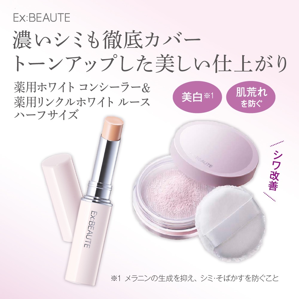 メイクしながらスキンケア & 美白(※1)する2つのアイテムで、美しい肌をめざせるキット。「薬用ホワイト コンシーラー」は、気になるシミをカバーしながら美白(※1)医薬部外品。スキンケアしながら、明るく素肌のようななめらか均一肌をキープします。「薬用リンクルホワイト ルース ハーフ」は、シミ・くすみをカバーしながらシワ改善し、美白(※1)までする医薬部外品フェイスパウダー。しっかり保湿効果で乾燥しにくく、ふわりとトーンアップ(※2)して、透明感のある明るい美肌を演出します。この冬新しく仲間入りしたルースパウダー。ハーフサイズでぜひお試しください。※1 美白とはメラニンの生成を抑えて、シミ・そばかすを防ぐこと※2 メイクアップ効果によるエクスボーテ2021年に全面リニューアル。これまでの高いカバー力と素肌のような透明感はそのままに、光を味方にする新発想により、「私らしく、心地よく豊かに過ごすため」のベースメイクブランドへと進化しました。エイジングケア(※)世代の肌悩みをカバーしつつ、うるツヤ肌からさらさらマット肌まで、自由自在な仕上がりをお楽しみください。※ 年齢に応じたお手入れ