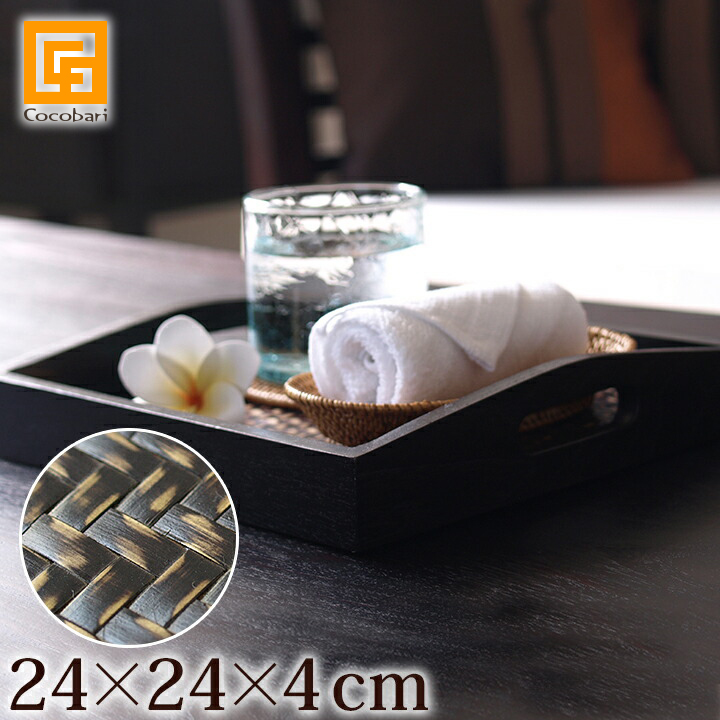 ■商品説明チークとバンブーでできたスクエアのトレイです。全体は丈夫なチーク材でできています。内側のバンブーを編んで作られた模様が、アクセントになっています。持ち手が付いていますので、お茶を出すときの配膳トレイとしても活躍してくれます。とってもおしゃれなのでトレイのままテーブルへ。飲み終わったらトレイごと片付けられて便利です。高級感がある質感とカラーで、アジアンリゾートな雰囲気を演出できます♪小さめのインテリアを飾るトレイとしてもお使いください!トレイにまとめると、空間がすっきりおしゃれになります。素材違いの同サイズのトレー(チーク&椰子)スクエアがございます。 ■サイズ縦:約24cm 横:約24cm 高さ:約4cm■素材チーク、バンブーの葉■生産地バリ島■関連情報バリ雑貨、バリ島、アジアン雑貨、ハンドメイド、手作り、アメニティケース アジアンテイスト、リゾートホテル、お部屋、バリ風、ホテル、木製、インテリア、おしゃれ、モダン、デザイン、和室、トレー、バンブー雑貨、竹