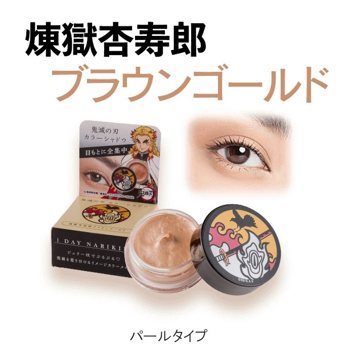 好きを日常にも!1DAY NARIKIRI カラーアイシャドウ 煉獄杏寿郎 ブラウン ゴールド ※こちらの商品は、パールタイプです。 ジェリーのような ぷるぷるの感触 ぷるぷるのテクスチャーが目もとでさらっと変化する ジェリー状のアイシャドウ。 透け感のあるほどよい発色で、ナチュラルにポイントカラーを取り入れられます。 "好き"を日常にも 目もとにカラーを忍ばせられるイメージカラーメイクコスメ。 ほどよい透け感発色のカラーアイシャドウで、「1 DAY NARIKIRI」を気軽に楽しんでいただくことを目指して開発しました。