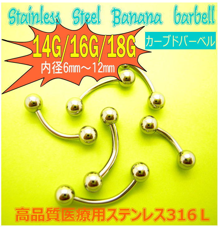 ■ボディピアス 14G 16G 18G バナナバーベル カーブドバーベル へそピアス ヘソピ 眉 アイブロウ 軟骨 定番 サージカルステンレス316L ban