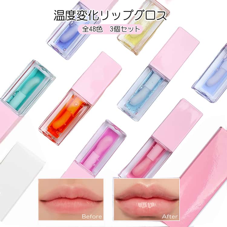 ■全48色 保湿 3本セット リップグロス カラーチェンジ 温度で色が変わるリップグロス 口紅 全48色 ツヤ オイル ティント 可愛い