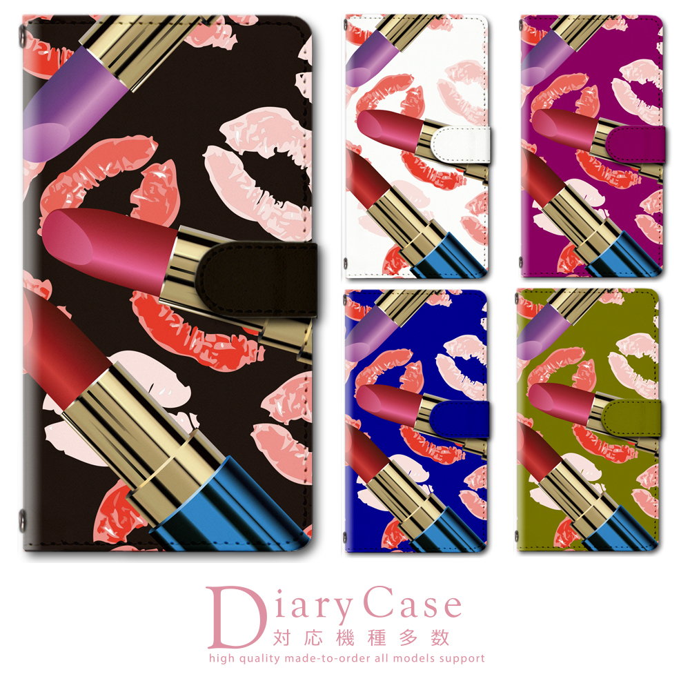 ■スマホケース 手帳型 多機種対応 カメラホール搭載 ストラップホール付き カード収納 ベルト付き コスメ柄 リップ柄 口紅 唇 化粧 手帳