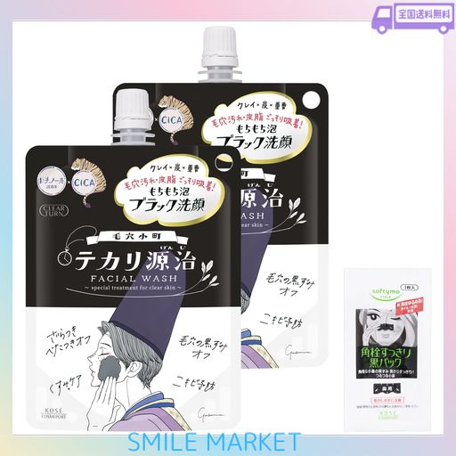 ■クリアターン KOSE 毛穴小町 テカリ源治 もちもちブラック 洗顔 テカリ ニキビ予防 2個セット おまけ付 洗顔フォーム 毛穴ケア