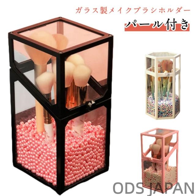 ■メイクブラシスタンド ガラス パール付 メイクブラシホルダー 蓋付き 四角 大容量 クリア 透明 メイクブラシ立て メイクブラシ 化粧ブラ
