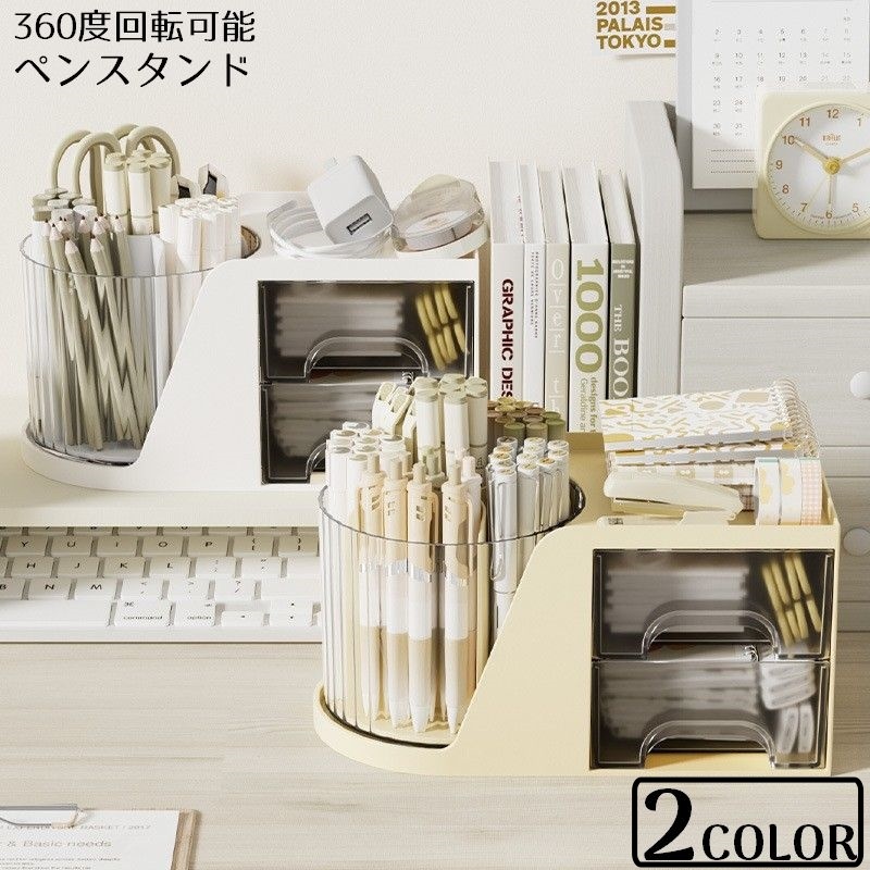 ■ペン立て ペンスタンド ペンホルダー 小物入れ 卓上収納ケース メイクブラシ コスメボックス 360度回転 引き出し 仕切り付き
