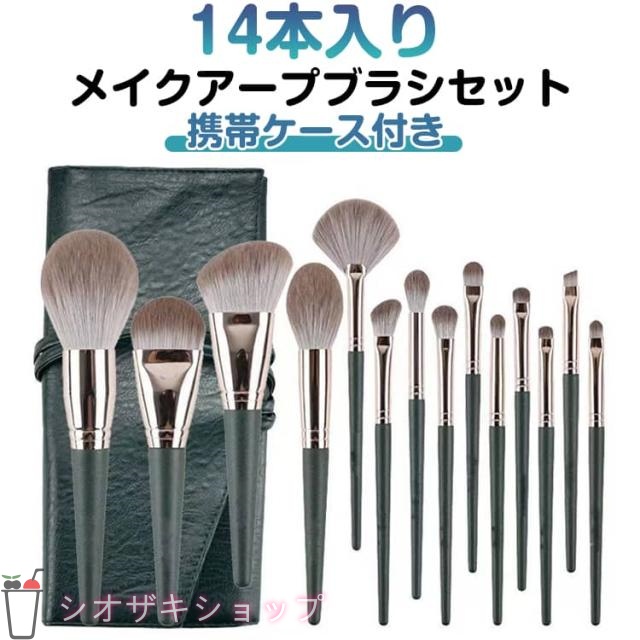 【14本入り+ケース付き】送料無料 メイクブラシセット メイクブラシ メイクポーチ 化粧ブラシ 収納ポーチ付き 柔らかい ふわふわ グリーン 旅行用 プレゼント 可愛い 化粧筆 化粧ブラシセット パウダーブラシ メイクグッズ アイシャドウブラシ