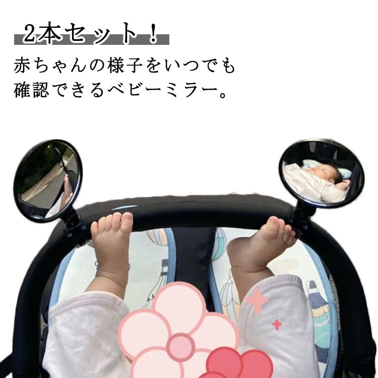 ■ベビーミラー 車 ベビーカー ミラー 鏡 自転車 ミラー 2本セット アクセサリ 丸型 360°回転 角度調整 コンパクト 後ろ向き 後方確認 凸