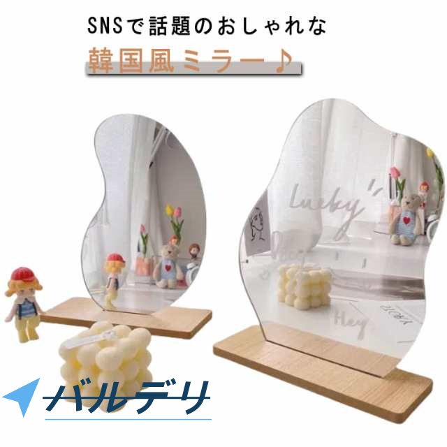 ■メイクアップ 卓上ミラー スタンドミラー 北欧 うねうね 韓国風 割れない 鏡 ミラー 変形 化粧鏡 鏡 木製台座 ムーンミラー インスタ映え