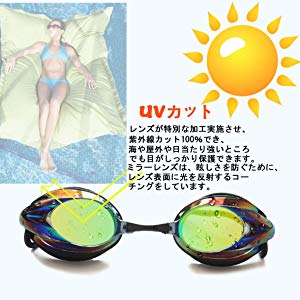 【曇り止め加工&超クリア視界】:クリアな視界が与えるために、スイミングゴーグルのレンズに特別な曇り止め加工され、左右視界範囲は180度以上を設計され、長い時間で水泳しても、クリアな視界を確保でき、水中での事故も防げます。また水中でスイムゴーグルのレンズ割れなどが心配なく、快適にスイミングを楽しむことができます。【UVカット効果抜群】:スイミングゴーグルのレンズが特別な加工実施させ、表面高級感に見えるだけではなくて、触り感も良くて、機能上でも紫外線カット100%でき、海や屋外や日当たり強いところでも目がしっかり保護できます。ミラーレンズは、眩しさを防ぐために、レンズ表面に光を反射するコーチングをしています!