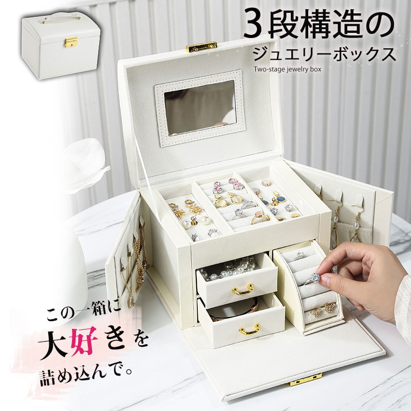 ■ポイント超超祭 ジュエリーボックス アクセサリーケース 大容量 持ち運び 3段 引き出し式 ミラー 鍵付き おしゃれ 可愛い ネックレス ピ