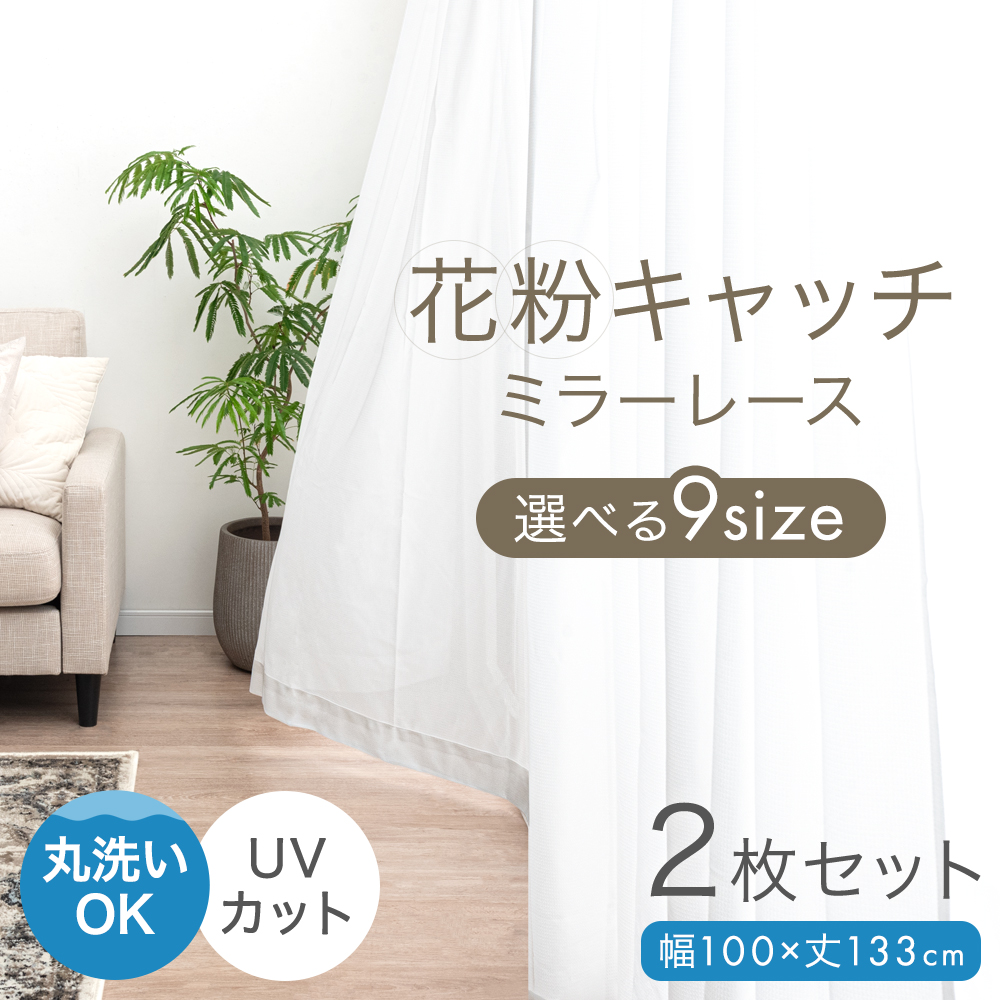 ■花粉キャッチ! ミラーレースカーテン 2枚組 幅100 丈133 アジャスター フック 洗える 見えにくい ミラーレース ミラー レースカーテン