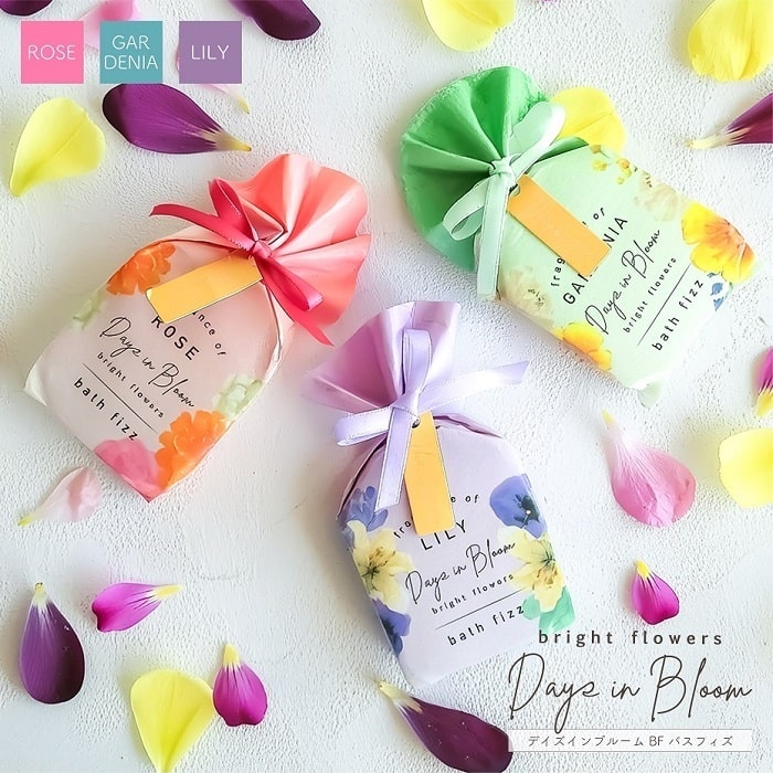 ■ 商品情報 ■ バスルームにやさしい花のアロマ広がる発泡タイプの入浴料。「Thank you」タグ付きでプチギフトにもおすすめ。 芳醇な花のアロマと華やかで温もりある雰囲気が魅力の『デイズインブルームのブライトフラワーズ』。気軽に楽しめる花々のアイテムが、毎日に彩りと豊かさを添えるようやさしく咲き香りるシリーズです。 保湿成分(シア脂・ホホバ種子油・ハチミツエキス)配合でお肌もしっとり、それぞれのカラーの湯色の中で体を休めながら、シュワっと楽しいバスタイムを。包装を取って浴槽のお湯にバスフィズを入れ、よくかき混ぜてご入浴ください。 ■ 香りの種類 ■ ・ローズ:ふんわり華やかなローズの香り ・ガーデニア:甘くエレガントなガーデニアの香り ・リリー:清楚で可憐なリリーブーケの香り