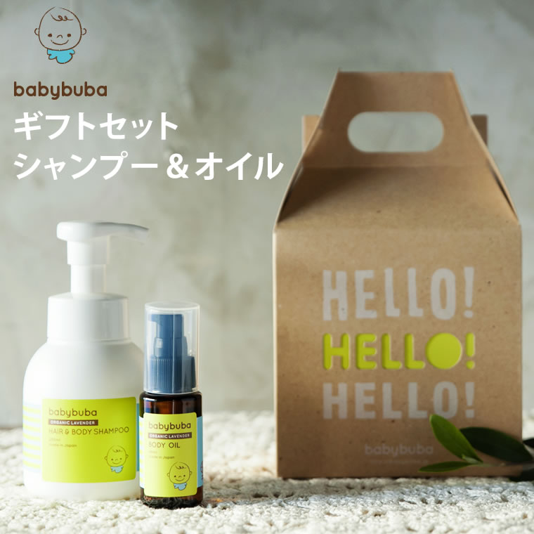 赤ちゃんのための国産オーガニックスキンケア「babybuba(ベビーブーバ)」 ベビーブーバ人気の2点がセットになったギフトセット。「ヘア&ボディシャンプー250ml」×1本「ボディオイル48ml」×1本日本人のお肌に合うよう設計されたヘア&ボディシャンプーとベビーオイル(ボディオイル)のセットです。お祝いや出産祝いなどに最適。毎日使えるアイテムなのでママ・パパに喜ばれるギフトセットです。0ヶ月から使えるベビーブーバの人気のスキンケア。泡ポンプボトルのヘア&ボディシャンプー(ボディソープ)は、きめ細かいなめらかな泡で、皮脂を落としすぎずしっとり洗い上げます。オーガニックオイルでお肌の表面に蓋をして保湿を持続的にサポートします。浸透力と肌触りの良いオイルはベビーマッサージにもおすすめです。