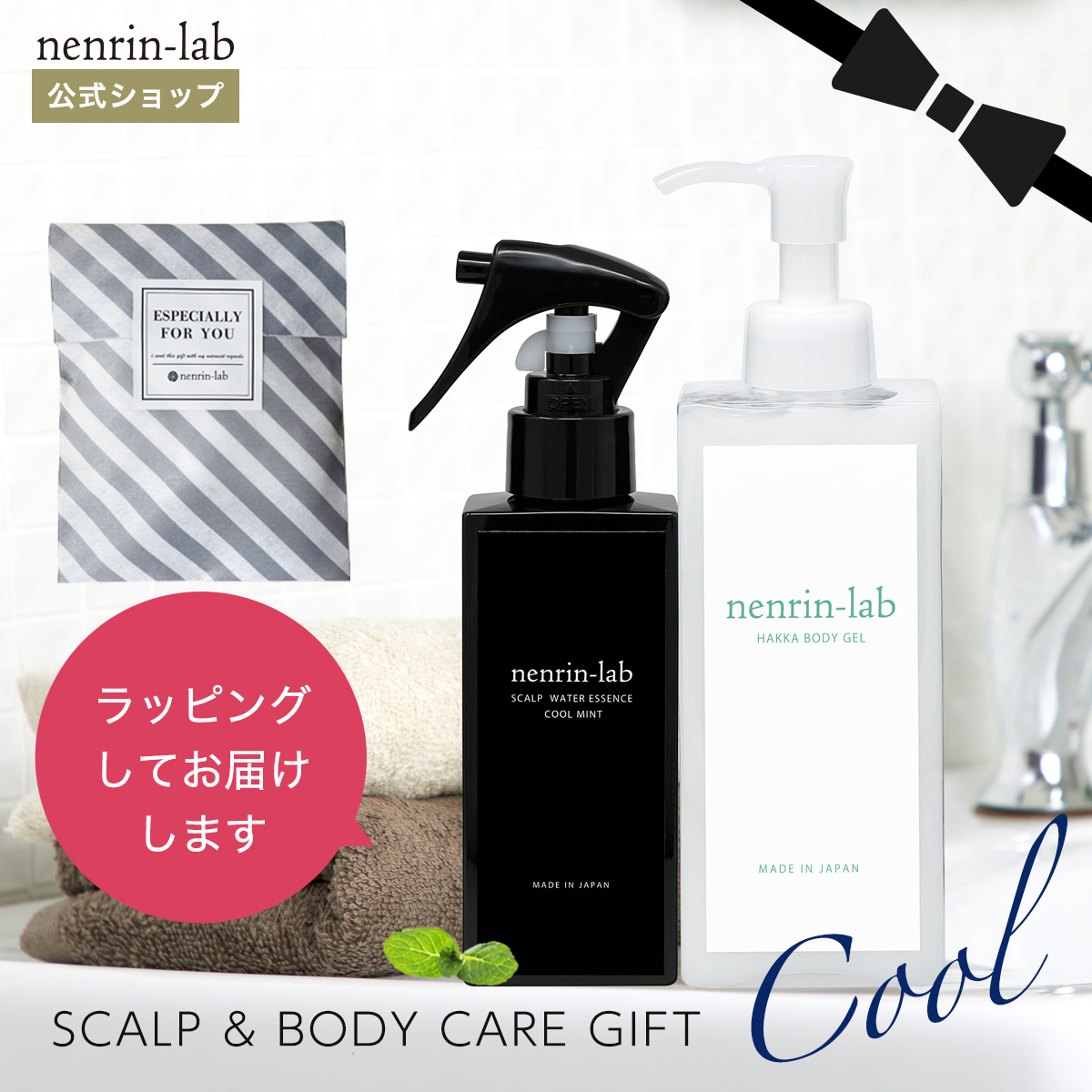 セット内容:ネンリンラボ スカルプウォーターエッセンス(クールミント)100ml×1本、ハッカボディジェル150g×1個 人気の冷感グッズのセットギフト。清涼成分ハッカ油配合の冷感ボディジェルと、頭皮用スカルプミストのセットで暑い夏でもひんやり爽快!暑さ対策、デオドラント、保湿ケアに使えます。女性だけでなく男性にも人気の製品です。おしゃれなグレーストライプのギフト袋にラッピングしてお届けします。暑い夏を少しでも快適に、夏のプレゼントにおすすめです。 【こんな時に】 暑さ対策グッズ プレゼント / 女性 / 男性 / メンズ / レディース / バレンタイン / バレンタインデー / バレンタインデイ / ホワイトデー / ホワイトデイ / 母の日 / 父の日 / お中元 / 敬老の日 / クリスマス / Xmas / 贈り物 / 贈りもの / 贈物 / 贈呈品 / 贈呈 / 贈答品 / 誕生日 / 誕生日プレゼント / 結婚 / 成人祝い /ハッカ油スプレー / ハッカ油/ 冷感 / 冷感スプレー