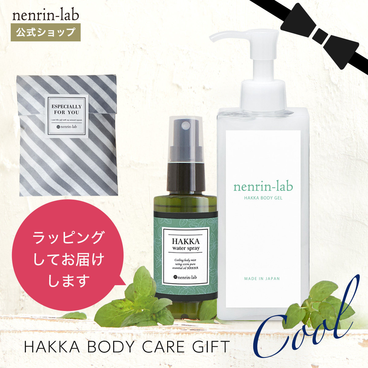 セット内容:ネンリンラボ ハッカウォータースプレー50ml×1本、ハッカボディジェル150g×1個 ハッカウォータースプレーは、ピュアハッカとハーバルアロマ、どちらかの香りをお選びいただけます。 人気の冷感グッズのセットギフト。清涼成分ハッカ油配合の冷感ボディスプレーと、冷感ボディジェルのセットで暑い夏でもひんやり爽快!暑さ対策、デオドラント、保湿ケアに使えます。女性だけでなく男性にも人気の製品です。おしゃれなグレーストライプのギフト袋にラッピングしてお届けします。暑い夏を少しでも快適に、夏のプレゼントにおすすめです。 【こんな時に】 暑さ対策グッズ プレゼント / 女性 / 男性 / メンズ / レディース / バレンタイン / バレンタインデー / バレンタインデイ / ホワイトデー / ホワイトデイ / 母の日 / 父の日 / お中元 / 敬老の日 / クリスマス / Xmas / 贈り物 / 贈りもの / 贈物 / 贈呈品 / 贈呈 / 贈答品 / 誕生日 / 誕生日プレゼント / 結婚 / 成人祝い /ハッカ油スプレー / ハッカ油/ 冷感 / 冷感スプレー
