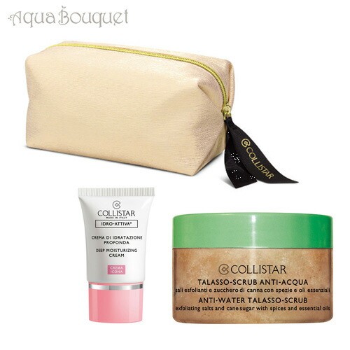 イタリアのコスメブランドといったら Collistar(コリスター)。 ヨーロッパではどこでも手に入るブランドですが、 日本では未だ未入荷のブランドです。 ボディケアシリーズに力を入れたラインナップの中、 コリスター人気のディクリームとスクラブのお得なトライアルキット。 お泊りやご旅行にちょうどいいサイズのお洒落なポーチ付き。 ・ディープモイスチャライジングクリーム(トライアルサイズ)15ml 顔用の滑らかなクリームは潤いを与えるだけでなく、 肌の水分バランスの自然なプロセスを調整し再活性化します。 軽いテクスチャーですっと馴染みます。 ・アンティウォータータラソスクラブ 150g 海の塩、サトウキビ、エッセンシャルオイルとスパイス、 アボカド、ホホバ、マカダミア、スイートアーモンド、ククイ、ダイズ油 などを豊富に含むボディスクラブ 週に1~2回ご使用ください。 (ひじ、かかと、ひざ)に集中ケア。 ・オリジナル ゴールドホワイトポーチ 素 材:表PVC加工 裏ポリエステル サイズ:約 長14.5cm×H9cm×マチ9cm