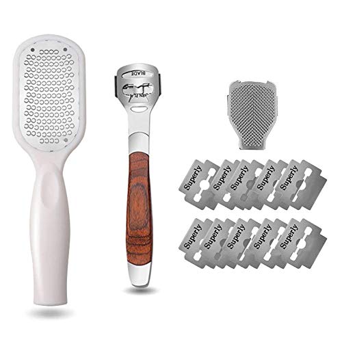 セット内容:(1)304ステンレス鋼足ヤスリ1個 (2)木柄角質削り器1個 (3)替刃10枚 (4)足揉み用メッシュ1枚 【360°のかかとの角質取り】 【鋭い刃】刃は304ステンレス鋼で作られていて、ナイフエッジの高さは1mmです、それは肌を傷つけません。 【角質収納ケース付き】刃を保護するカバー付き、不要な角質を粉状にこそぎ取ります。 カバーは削りカスケースになるので、削った角質はそのままゴミ箱へポイッと捨てられ、後片付けもラクチン! そのままサッと洗い流せて衛生的です。 水洗い可能なので、浴室でも使えます 【水洗いOK!】お風呂で使えます:乾燥した足、濡れた足どちらにも使え、水洗い可能なのでモチロンお風呂でも使えます。カバーを裏側につけ、かかとに刃をあてて削るだけなのでカンタン!使用後はさっと洗って衛生的。