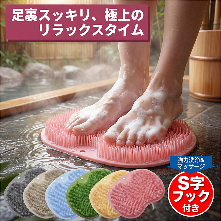■フットブラシ S字フック付き やわらかい 足洗いマット 足臭バスター 足裏ブラシ フットケア 足洗用 吸盤付き かかと 角質 角質ケア 足裏
