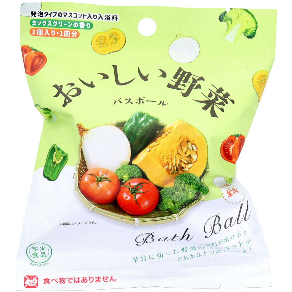 半分に切った野菜のマスコットがどれかひとつ出てくるよ!発泡タイプのマスコット入り入浴料。●半分に切られた野菜のマスコットを2個集めて合わせると....なんと丸ごと野菜になっちゃうんです!●ミックスグリーンの香り。●マスコットは全5種(※種類は選べません)。・トマト・たまねぎ・ピーマン・かぼちゃ・ブロッコリー