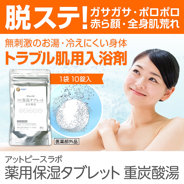 薬用保湿タブレット 重炭酸湯はトラブル肌に特化した薬用入浴剤です。重炭酸イオンがめぐりを良くしいつまでも冷えにくく、残留塩素を中和し、お肌に優しい入浴剤です。乾燥ガサガサ肌、肌荒れ、しっしんなどでお悩みの方に温浴効能:荒れ性、しっしん、あせも、ひび、にきび、しもやけ、あかぎれ、痔、肩のこり、腰痛、疲労回復、冷え性、神経痛有効成分:炭酸水素ナトリウム、炭酸ナトリウム