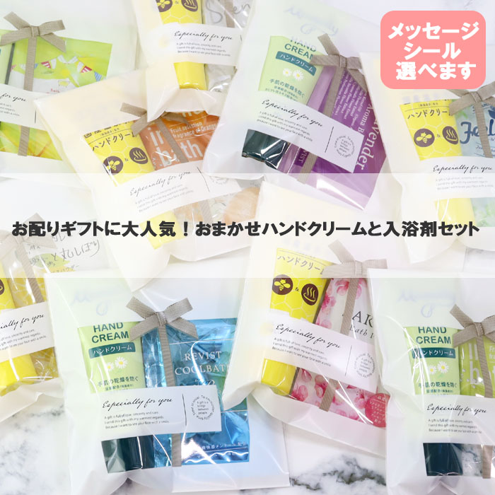 【セット内容】アソート入浴剤1個とハンドクリーム1個***当店がランダムにお入れしますのでお選びいただけませんのでご了承下さいませ。【ご注意】*掲載写真はデジタルカメラを使用している関係上、実際の商品と色および質感など、若干異なる場合がございます。予めご了承お願いいたします。***当店では、他にはないオンリーワンの店舗オリジナルの贈り物! をご用意しております。 ・クリスマス 母の日 父の日 こどもの日 敬老の日 バレンタインデー ホワイトデー ハロウィン などのイベントに ・誕生日 節句 七五三 入園 卒園 入学 進級 卒業 成人式 就職 結婚 出産 引っ越し 新築 などのお祝いごとに ・結婚 出産 などのお祝い ・引っ越しや新築、退職などのあいさつに ・そのほか行事やイベントの景品、粗品などのプチギフトなど ご自宅用をはじめ、ギフトにも最適な商品を数多く取り揃えております。