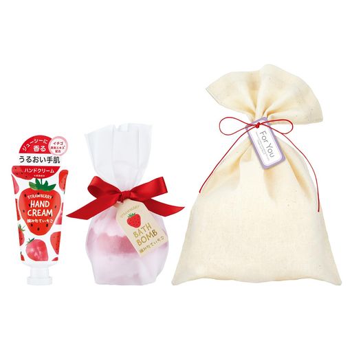■フルーツの森 摘みたてのあまずっぱいいちごの香りの贈り物 ラッピングバッグ入りギフト(ハンドクリームとバスボム各1 保湿 入浴剤 フル