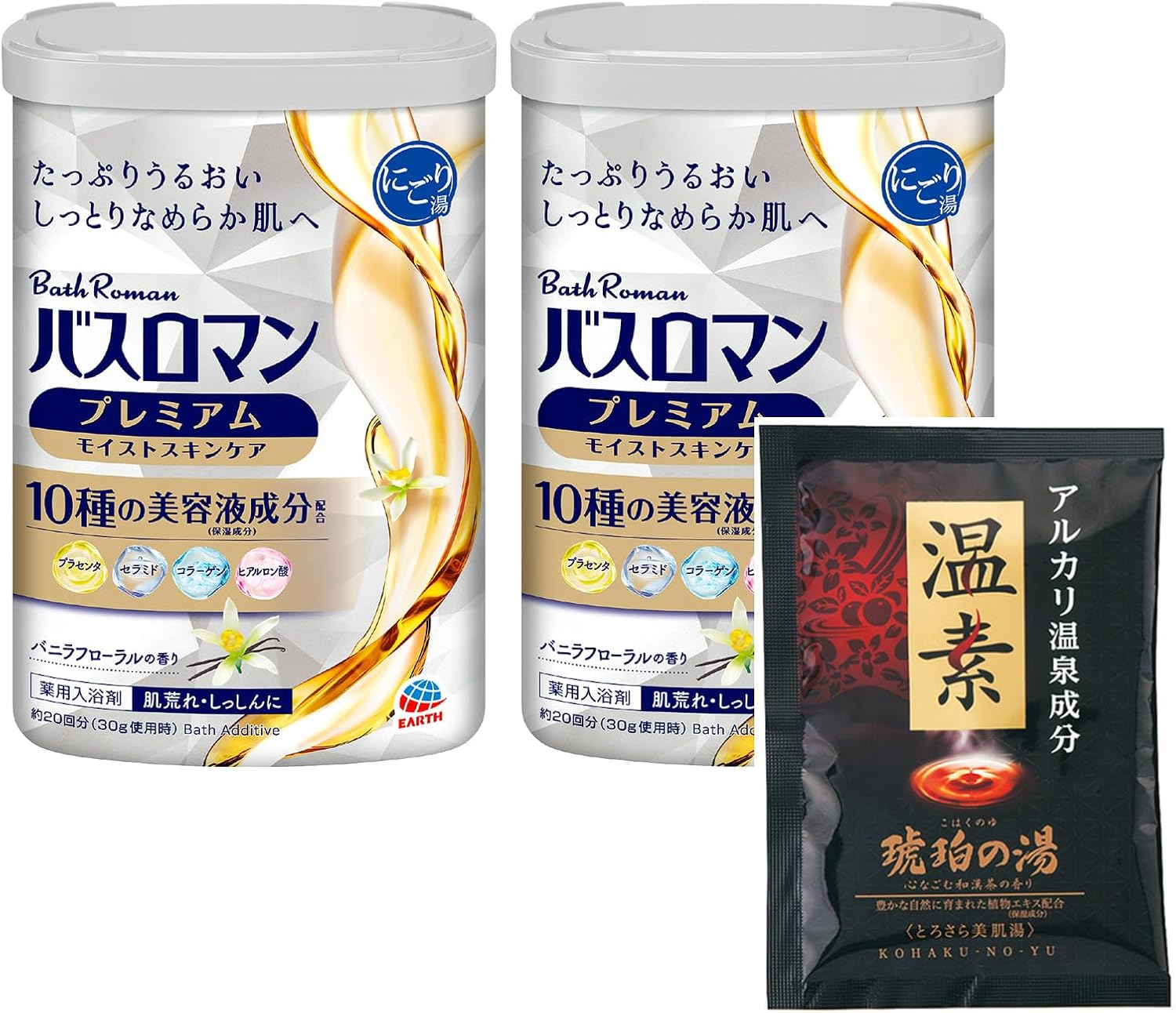 ■【訳あり】バスロマン プレミアム モイストスキンケア×2+おまけ (温素琥珀の湯1包) 薬用 入浴剤 [医薬部外品] 血行促進 肩こり 腰痛 (ア