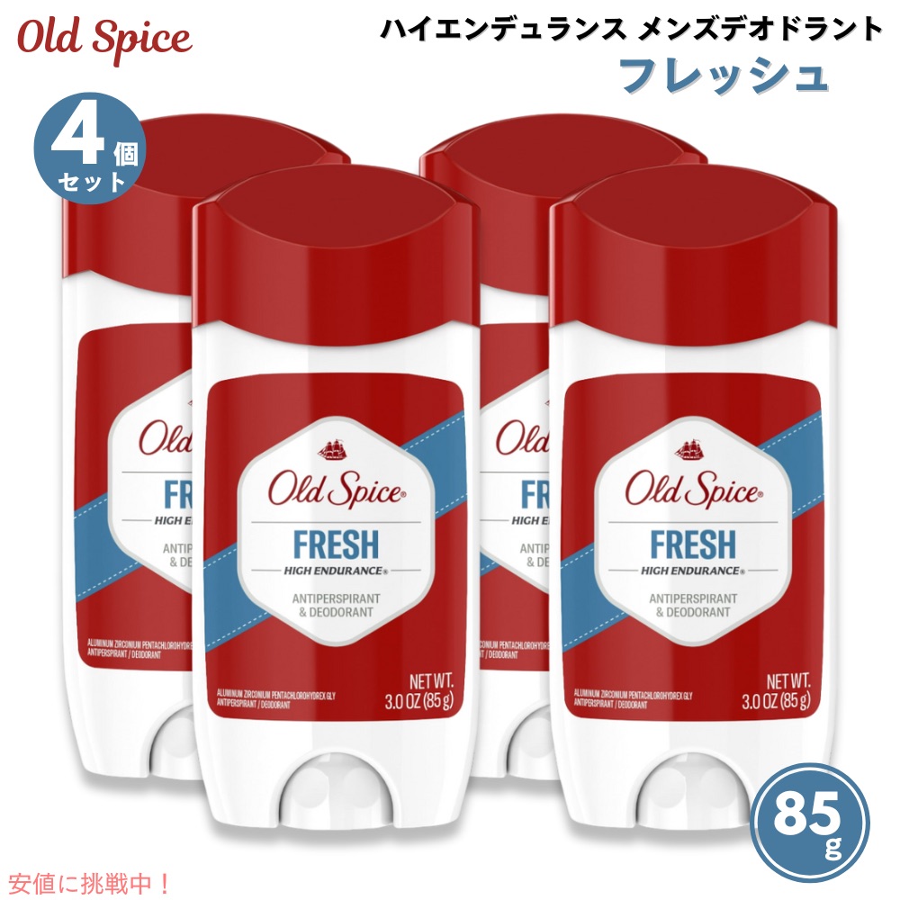 <4個セット> ブランド:Old Spice(オールドスパイス) 商品:ハイエンデュランス デオドラント 香り:フレッシュ(瑞々しく爽やかな香り) 内容量:85g(3oz) 数量:4個 ・衣服に白い跡が残りにくいインビジブルソリッド ・爽やかな香りが持続します。 【使用方法】本体下部のダイヤルを回し中の製品を出し、気になる部分に直接つけます。 *パッケージのデザインは写真と異なる場合がございます。あらかじめご了承くださいませ。