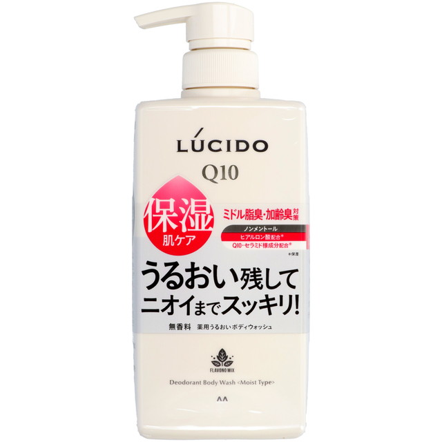 ●LUCIDO Q10 ルシード 薬用デオドラントボディウォッシュ〈無香料・無着色〉●40才からのニオイケア&みずみずしく洗い上げる、さっぱり肌ケア。●ニオイ気にならない、清潔感ある健康的な肌へ導く。フラボノ洗浄+Q10(*1)・セラミド様成分(*2)配合(保湿)●「洗浄」高い洗浄力でニオイの元となる汗やベタつく皮脂までしっかり洗い落とす。アミノ酸系洗浄成分配合。●「防臭」緑茶エキスが加齢臭・体臭や汗臭を消臭し、ニオイを防ぐ。殺菌成分がニオイ菌を殺菌し、ニオイの発生も防ぐ。●「肌ケア」ヌルつかず サッパリとした洗い上がり。乾燥しがちな肌をみずみずしい清潔肌に整える。●植物フラボノミックス(カンゾウ抽出末、桂皮エキス)、Q10(*1)、セラミド様成分(*2)配合(保湿)●販売名:薬用デオドラント ボディウォッシュV〈医薬部外品〉[*1:ユビデカレノン][*2:グリセリル-N-(2-メタクリロイルオキシエチル)カルバメート・メタクリル酸ステアリル共重合体]