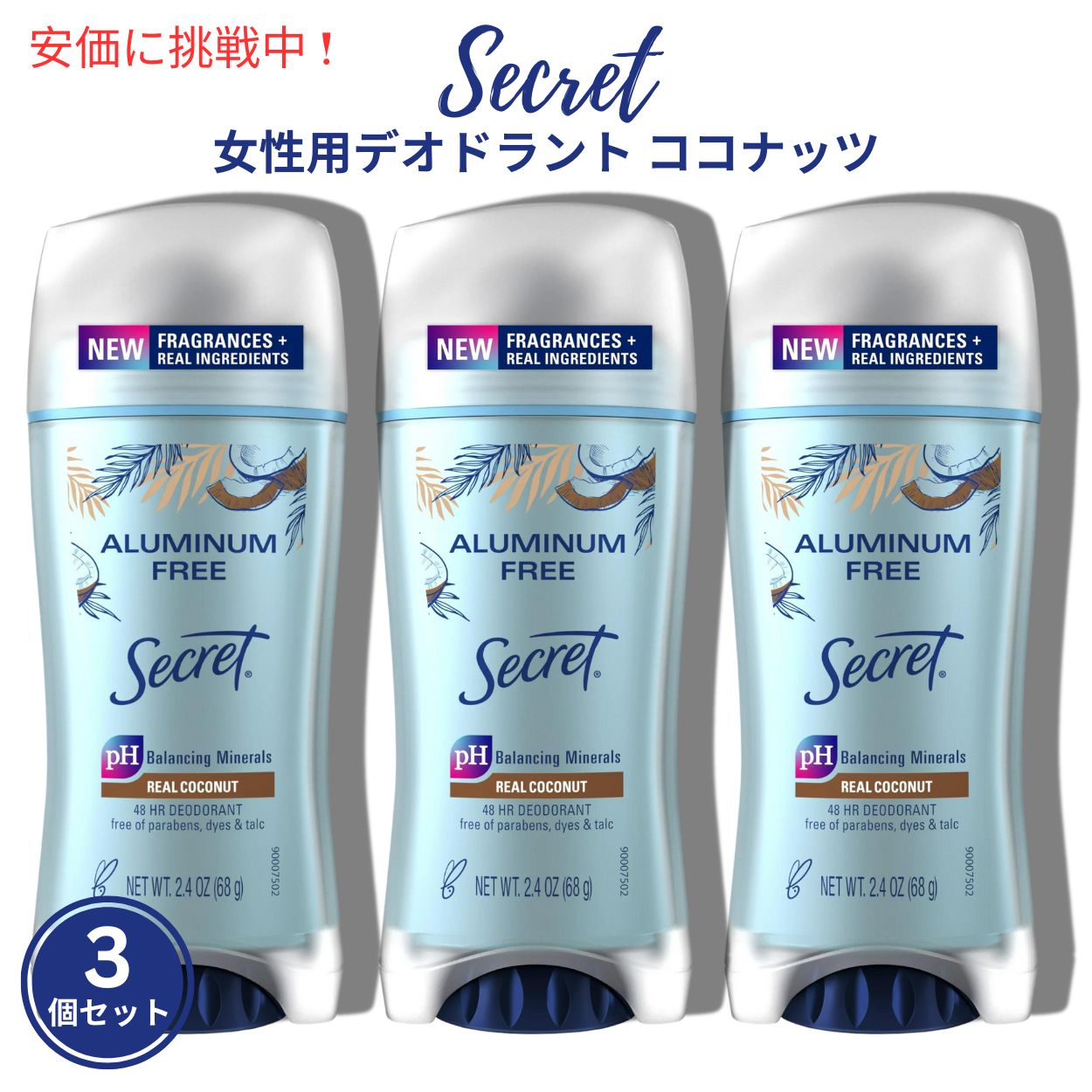 ■3個セット Secret シークレット 女性用 デオドラント ココナッツ 2.4oz/68g アルミニウムフリー Aluminum Free Deodorant for Women, Coc