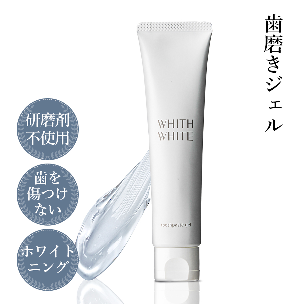 【口内のエイジングケア】美しい歯は歯の白さだけではありません。虫歯予防・歯を白くする・歯周病予防※・口中を浄化する・口中を爽快にする・口臭予防※歯周病は歯周炎・歯肉炎の総称【こんな悩みありませんか?】口臭が気になる…朝起きた時口の中が気持ち悪い…歯茎が赤く腫れている… 歯周病が原因かもしれません。【WHITH WHITEの歯磨きジェル】研磨剤なしで汚れを落とします。「フッ化ナトリウム」「グリチルリチン酸ジカリウム」「塩化セチルピリジニウム」3つの薬用成分配合で歯周病を予防します。【歯周病予防+ホワイトニング】WHITH WHITEでは歯磨き粉・マウスウォッシュも販売しております。同時購入がオススメです。