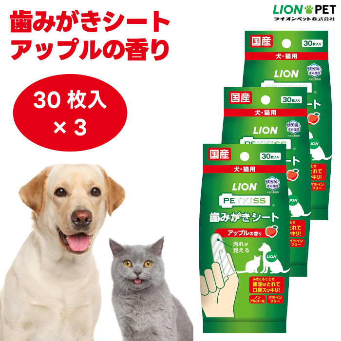 ■ライオン PETKISS 歯みがきシート アップルの香り ペット用 30枚x3個 犬 猫 デンタルケア 歯磨き 歯垢 口臭 使い捨て ノンアルコール パ