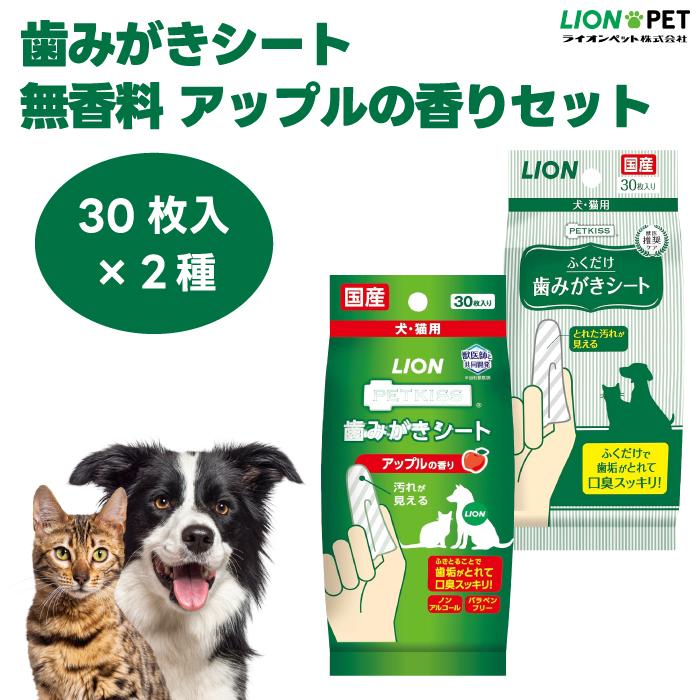 ■ライオン PETKISS 歯みがきシート 無香料 アップルの香り 30枚 2種セット 犬 猫 デンタルケア 歯磨き 歯垢 口臭 使い捨て ノンアルコー