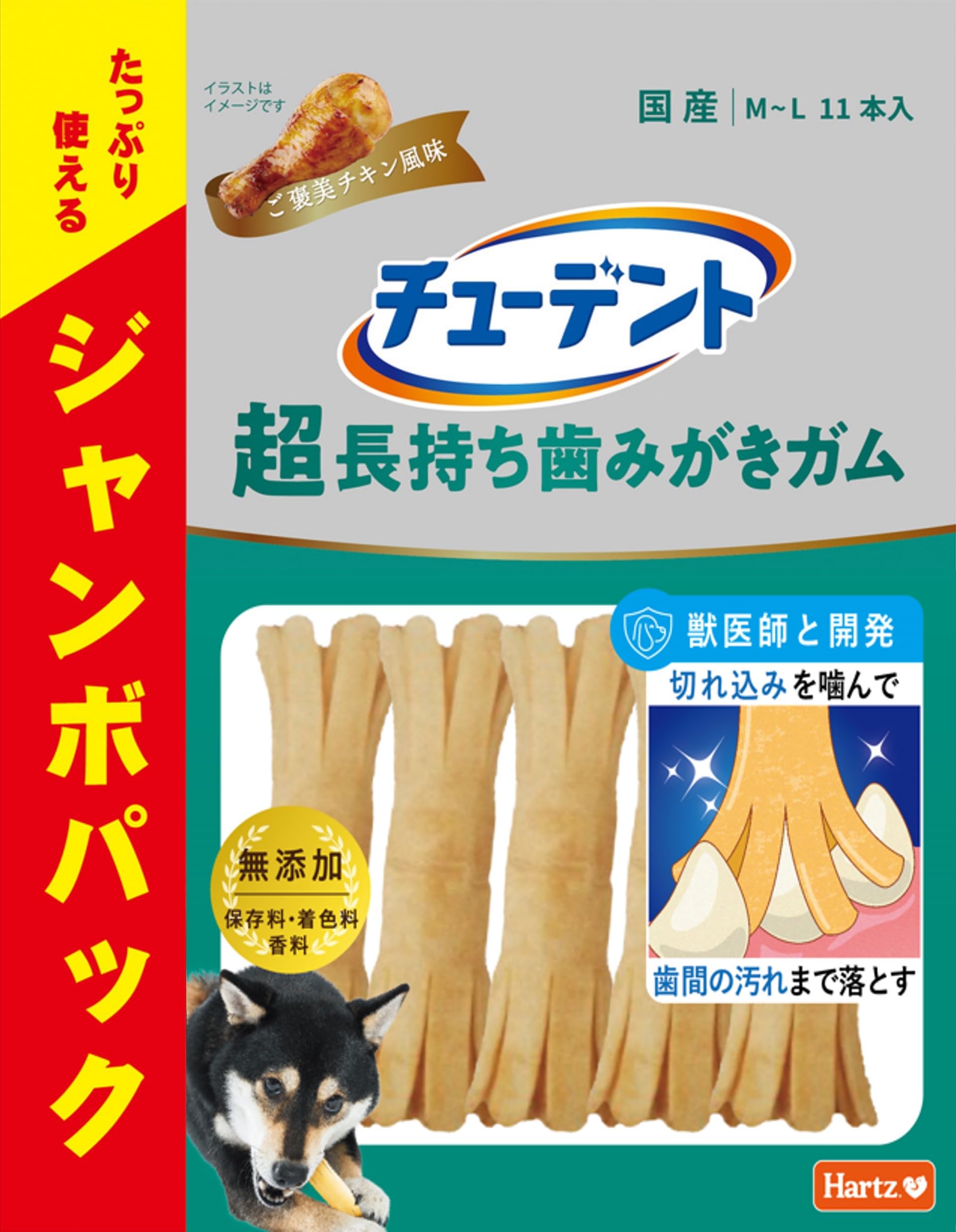 ◆商品名:チューデント 超長持ち歯みがきガム M-L 11本入 ジャンボパック ご褒美チキン風味 ハーツ(Hartz) 犬用おやつ 犬用ガム 歯磨き デンタルケ