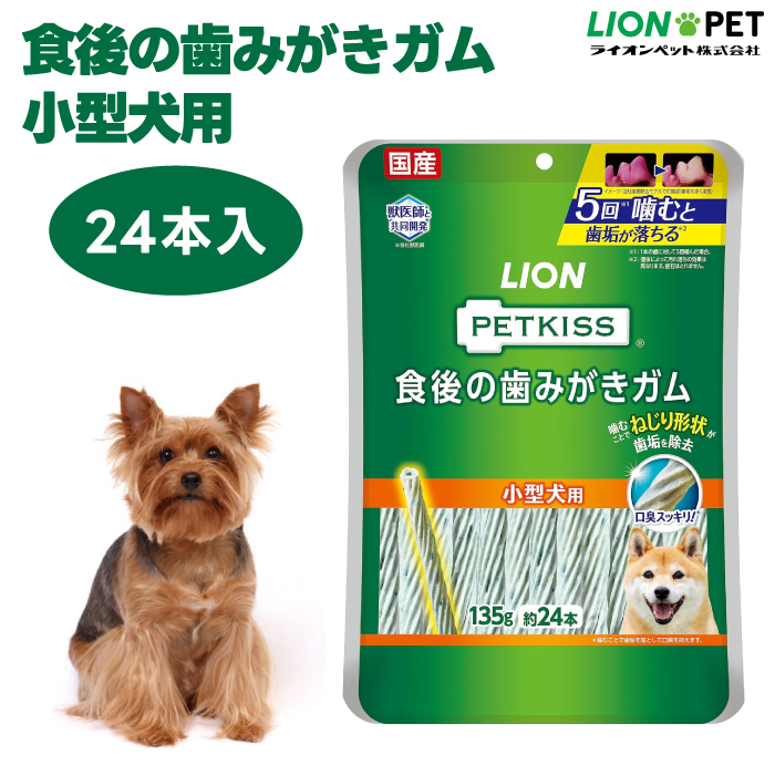 ライオン PETKISS 食後の歯みがきガム 小型犬用 135g(約24本) 対象 小型犬用(体重:5?10kg) タイプ おやつ 機能 デンタルケアガム ライフステージ 生後7ヶ月以上 特長 ●愛犬の歯に合わせて、獣医師と共同開発した長く噛める歯みがきガムです。 ●ケアがしにくい奥歯の歯と歯ぐきの境目汚れに着目。独自のブラッシング繊維のガムをギザギザねじり形状に。ギザギザねじり形状のガムを噛むことで、歯面の歯垢をかき出します。さらに噛むことで、ブラッシング繊維が歯垢を落とします。 ●ポリリジン、ピロリン酸ナトリウム配合で、歯と歯ぐきの健康を維持します。