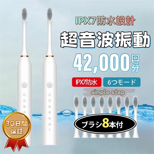 ■【ブラシ8本付き!】電動歯ブラシ 替えブラシ 替えブラシ8本付き 音波歯ブラシ 充電式 本体 超音波 歯ブラシ IPX7 防水設計 歯磨き 静音