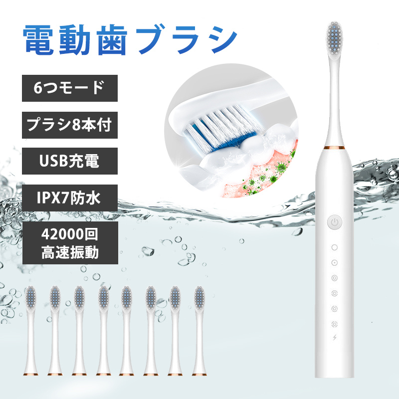商品詳細: カラー:/ホワイト サイズ:/画像通り 【商品説明】 歯ブラシ 本体 替えブラシ8本付き 18モード 42000回転/分 usb充電式 替歯ブラシ付き 電動 おしゃれ コンパクト 振動 タイマー機能 過圧防止 プレゼント ギフト 敬老の日 母の日 父の日 高速振動 毎分42,000回の振動 磨きすぎ防止タイマー機能 適切な時間でのブラッシングをサポートするタイマーを搭載。 6つモードの音波振動で目的に合わせた歯ブラシ USB充電式 フル充電で約30日間使用することができます。普段使っている歯ブラシを旅行中にも使い方におすすめです。 替えブラシ8本付き 使い始めからしばらくはブラシの交換の心配が無用! IPX7の高い防水性能 IPX7の防水スペックを誇る当商品は、浴室での使用や水洗いも安心。