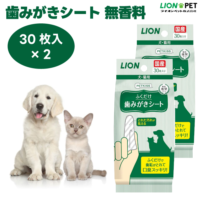 ■ライオン PETKISS 歯みがきシート 無香料 ペット用 30枚 x2個 犬 猫 デンタルケア 歯磨き 歯垢 口臭 使い捨て ノンアルコール パラペン