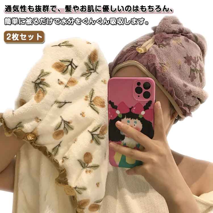 ■2枚セット ヘアドライヤーキャップ ヘアケア 吸水速乾 髪乾燥キャップ 2枚セット 入浴後 タオル地 かわいい バスタイム 手放し 花柄 くつ