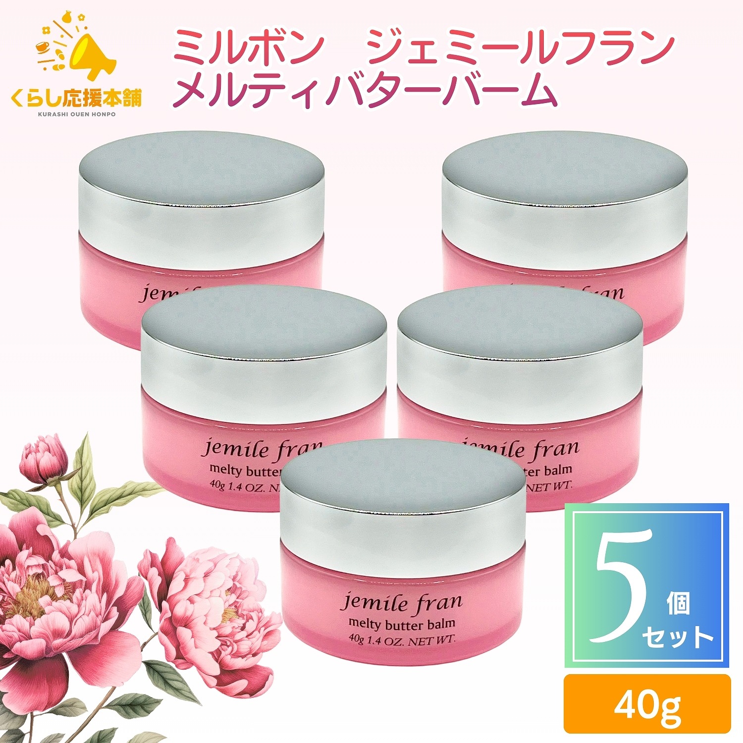 【送料無料】【5個セット】 ミルボン ジェミールフラン メルティバターバーム 40g トリートメント 洗い流さないトリートメント ヘアケア まとまる 艶髪 ジェミールフランメルティバター シアバター つや髪 ツヤ髪 スタイリング スタイリング剤 ヘアトリートメント ハンドクリーム 洗い流さないトリートメントで夜のまとまりを記憶メルティバターの夜のまとまり記憶の力。朝、思いのままキレイづくり。まとまりを記憶させるモイストトモリンガバター配合。 ドライヤーの熱で溶けてなめらかな液状に、常温で冷えて固まり朝までまとまりを維持します。シアーバターを加えた植物性バターのダブル配合で、もっとうるおいを与えてもっとまとまる髪に。ハンドクリームとしても使える固形タイプ。やさしくリラックス効果のあるピュアピオニーの香り。
