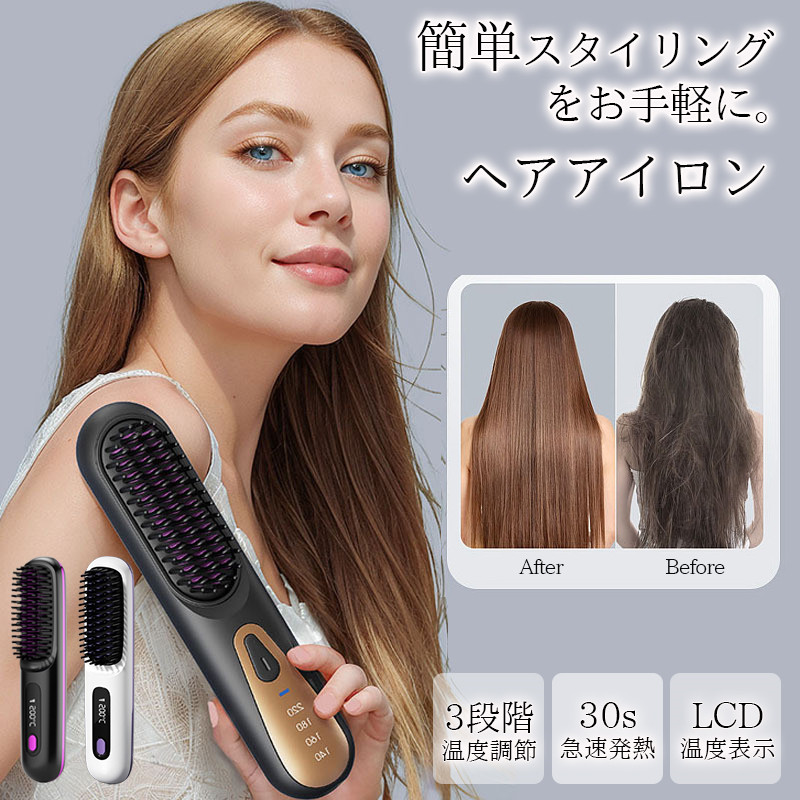 ■ヘアアイロン ストレート ヘアアイロンブラシ コードレス ヒートブラシ Type-C充電式 携帯用 3段階温度調整 急速加熱 軽量 ヘアケア
