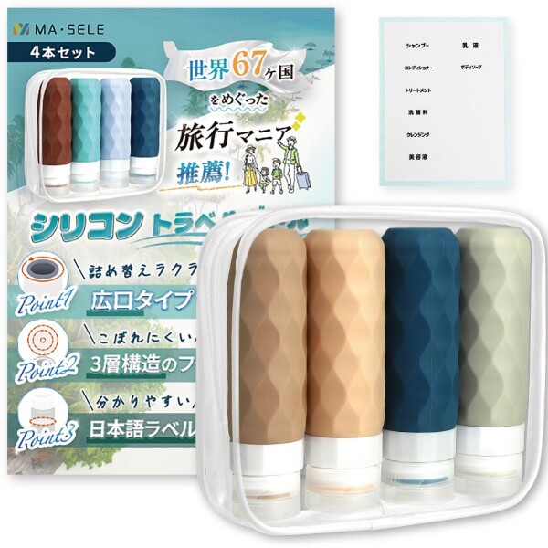 ■日本企業企画品 MA・SELE シリコン トラベルボトル トラベルセット 詰め替えボトル 旅行用 出張用 シャンプー 収納 ポーチ ラベル付 (90m