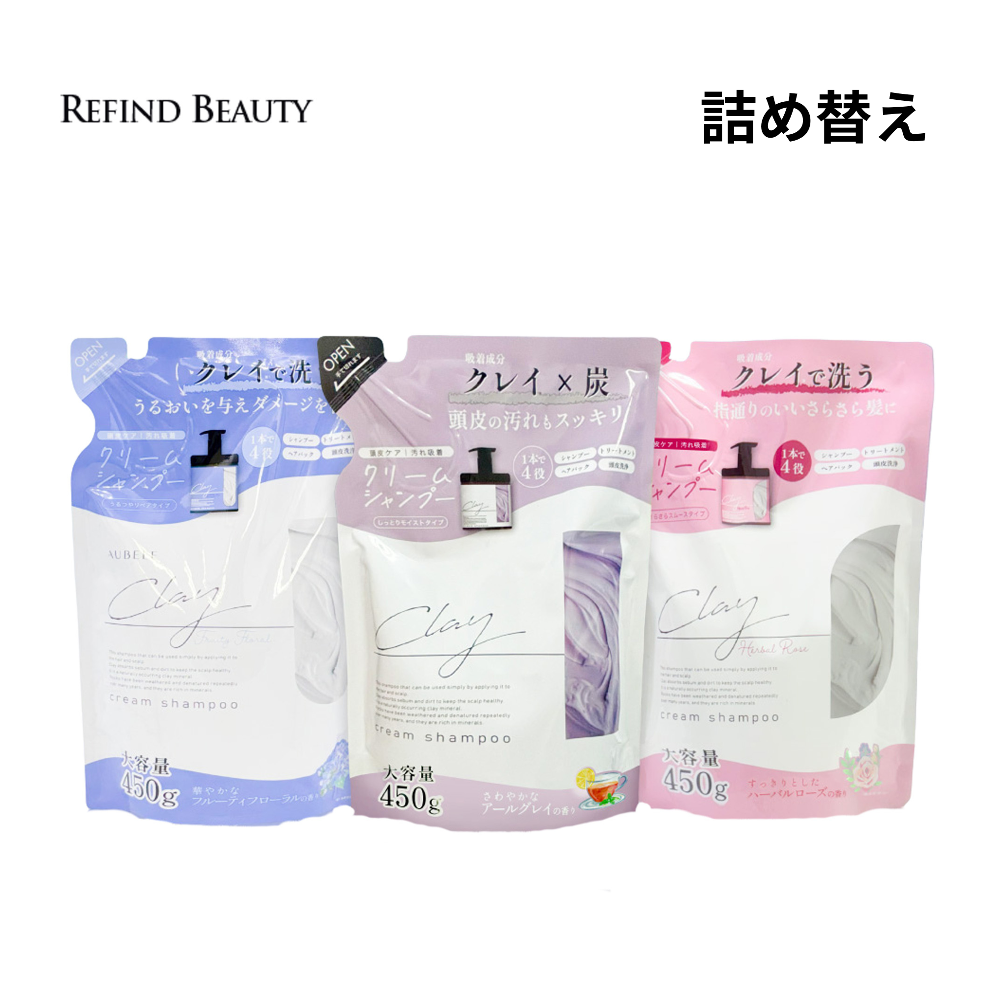 ■【詰め替え クレイ クリーム シャンプー 450g】 クレイシャンプー クリームシャンプー ヘッドスパ 毛穴 洗浄 炭 泥 ダメージ補修 保湿 潤